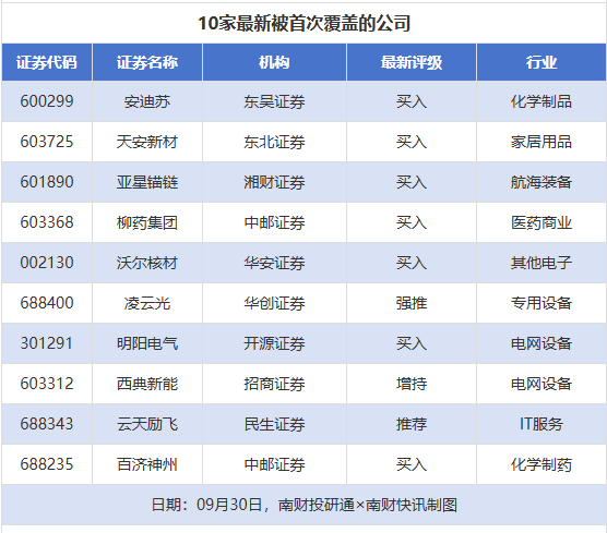首次覆盖方面,9月30日券商共给出了10次首次覆盖,其中安迪苏获得东吴证券给予“买入”评级,天安新材获得东北证券给予“买入”评级,亚星锚链获得湘财证券给予“买入”评级,柳药集团获得中邮证券给予“买入”评级,沃尔核材获得华安证券给予“买入”评级。